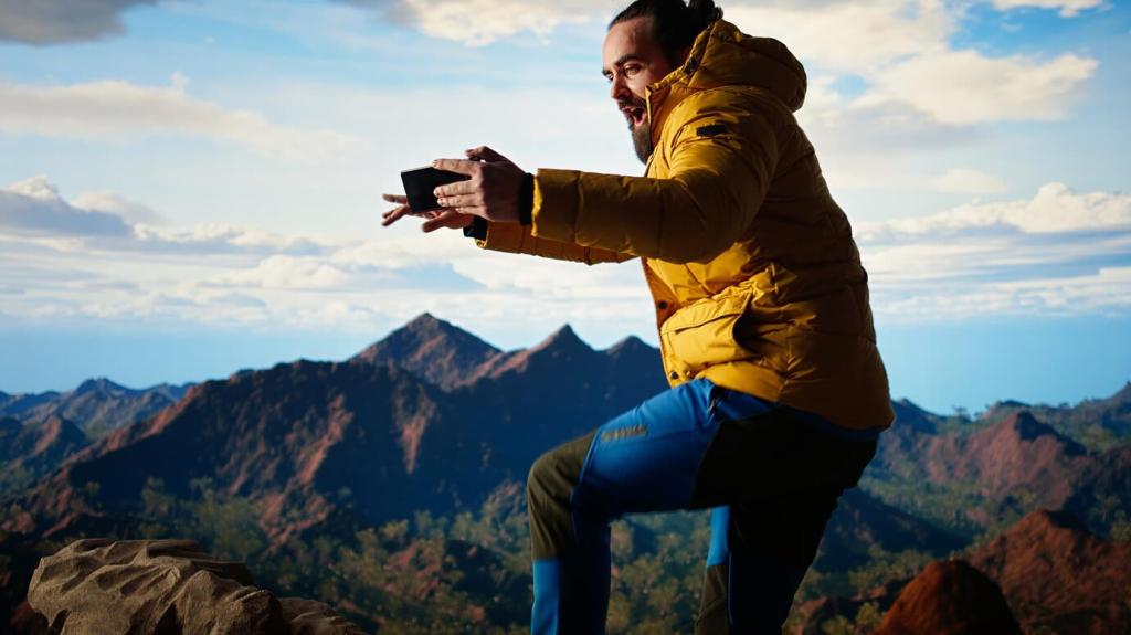 Walk into the sun and tilt slightly upward so needles, dust, and breath glow with halos. A narrow aperture turns sparkles into starbursts. Protect your eyes, shade your lens, and let silhouettes outline hikers against luminous air, translating effort into radiant, memorable frames.